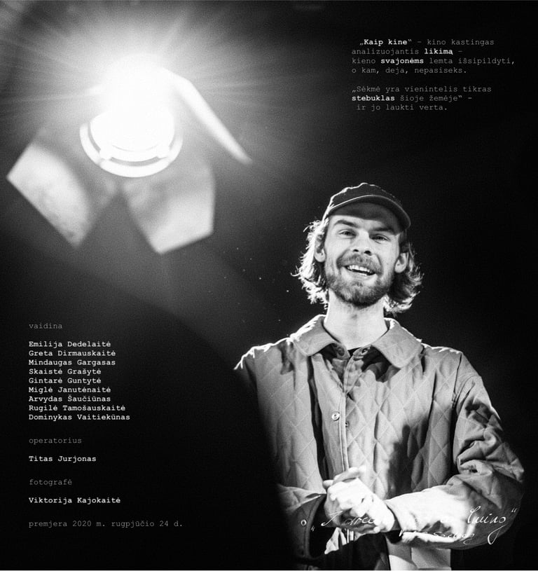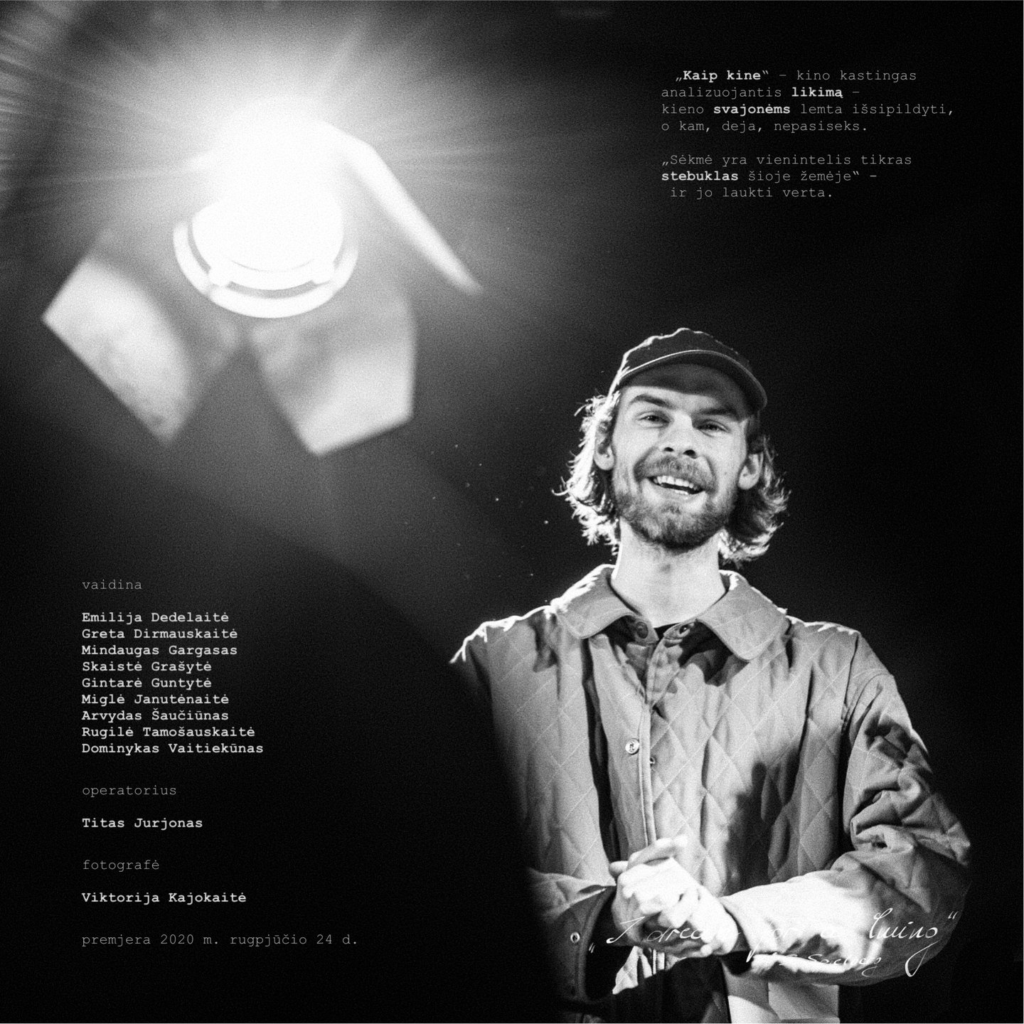 „Kaip kine“ – tai kino kastingas, perkeltine prasme analizuojantis likimą – kieno svajonėms lemta išsipildyti, o kam, deja, nepasiseks. Kaip teigia spektaklio herojus, „Sėkmė yra vienintelis tikras stebuklas šioje žemėje“ - ir jo laukti verta. Dalyvavimas atrankoje pažadina išlikimo instinktą – išlikti tarp konkurentų, išlikti sipresniam. „Kaip kine“ kūrybinės komandos išeities taškas – išlikti žmogumi.