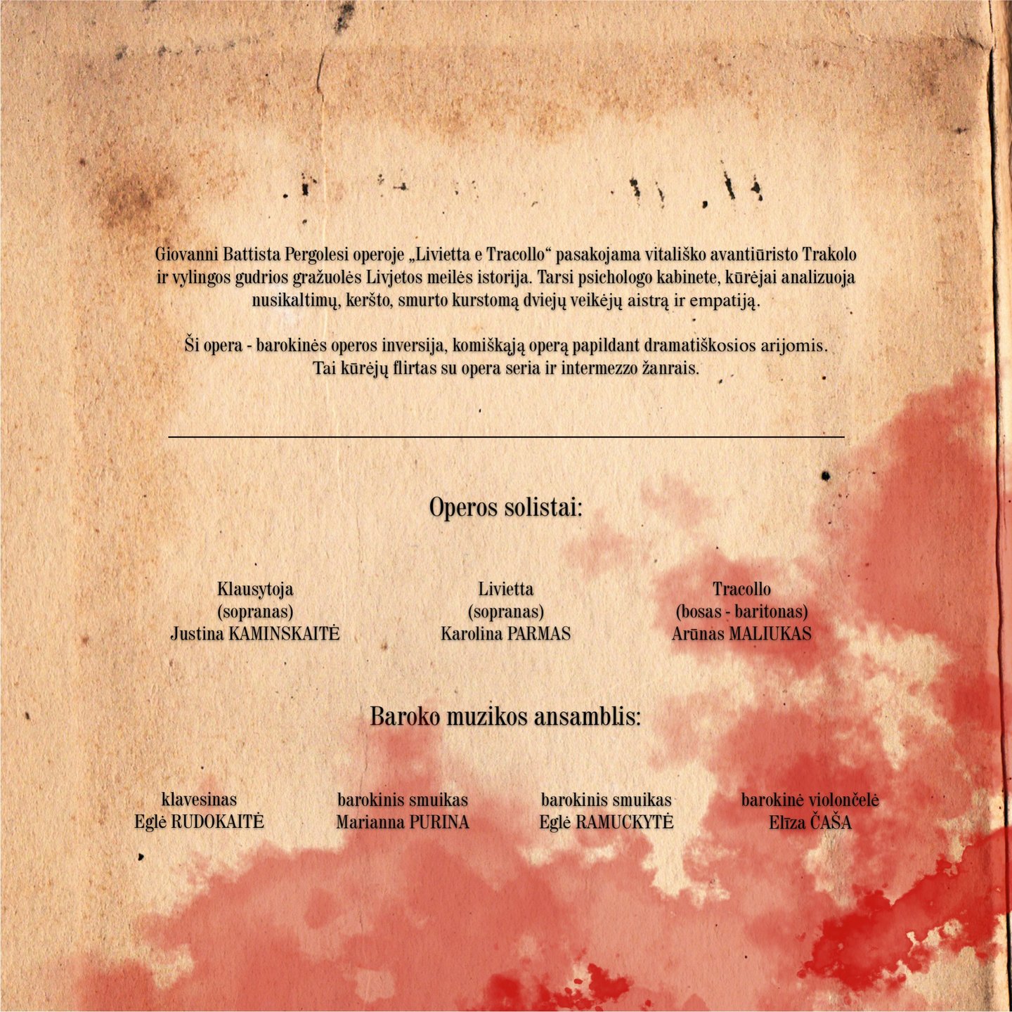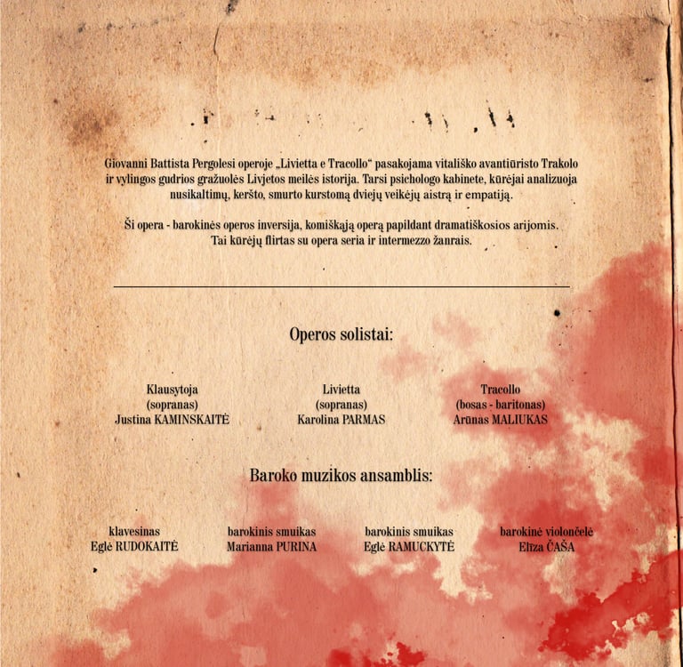 Šis komiškos operos pastatymas – tai jaunųjų kūrėjų, pirmosios Lietuvos muzikos ir teatro akademijos Baroko operos alumnų kartos flirtas su opera seria ir intermezzo žanrais. Vakaro ašis – Lietuvoje retai atliekama Giovannio Battistos Pergolesio opera „Livjeta ir Trakolas“ (Livietta e Tracollo).
